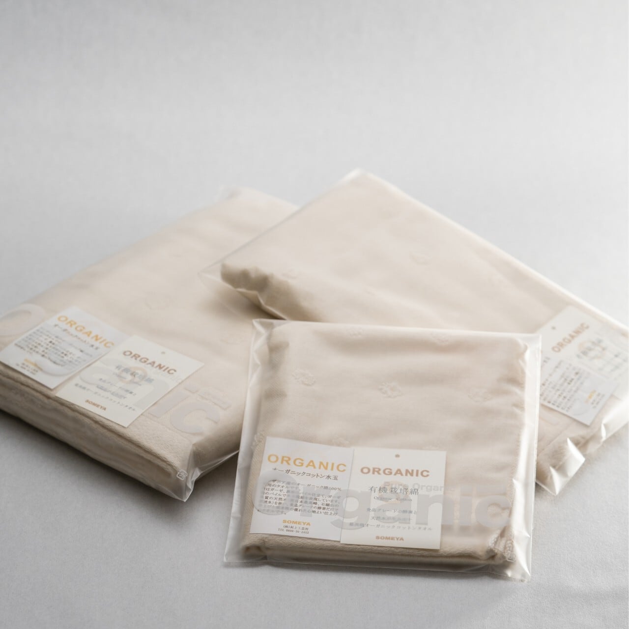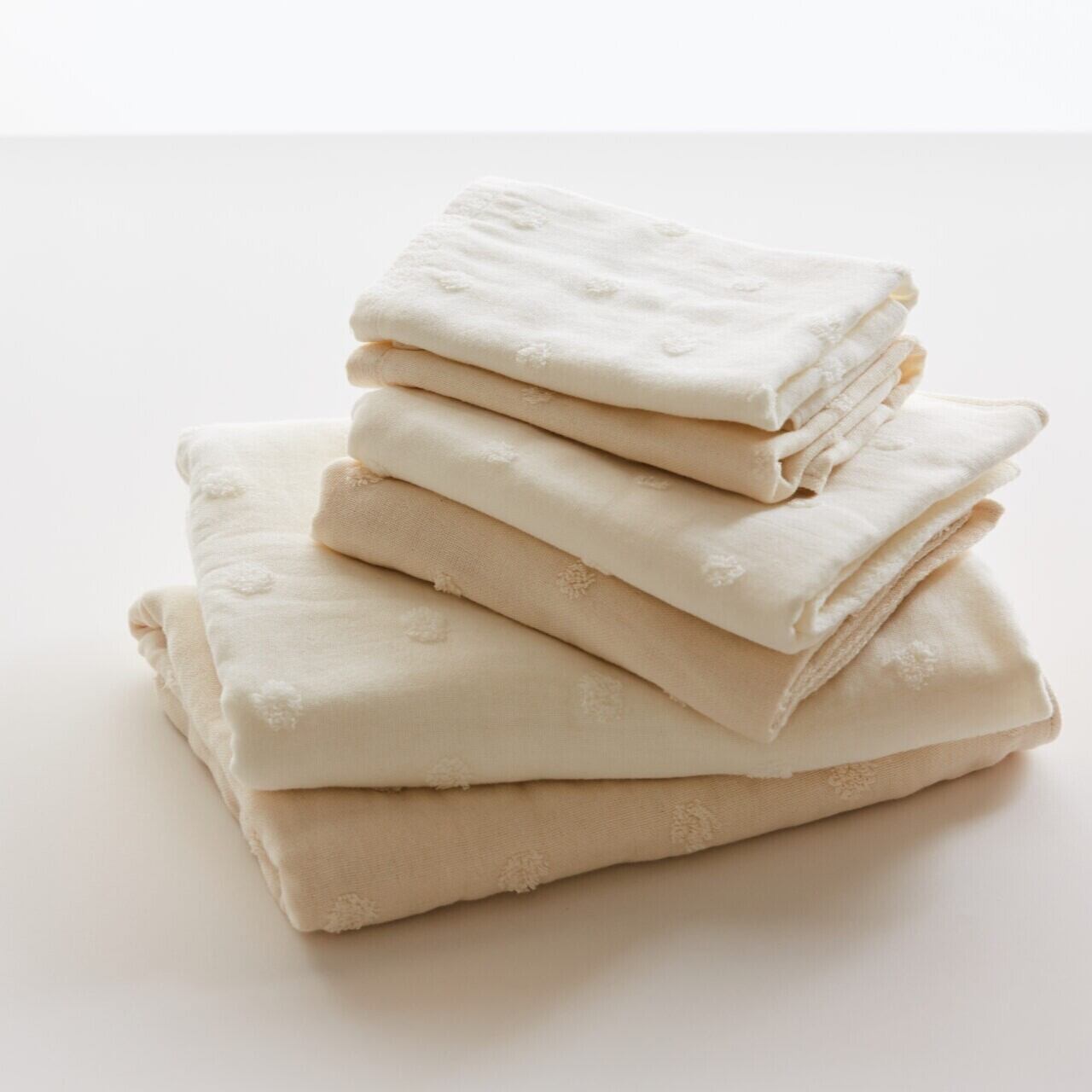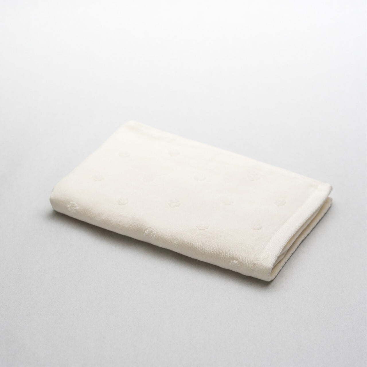 名水百選にも選ばれた四国山脈の伏流水と天然の酵素と石鹸を使用して仕上げています。タンザニア産のオーガニック綿を100%使用し、オーガニックコットンの国際基準であるGOTSの認証も受けています。蛍光増白剤、柔軟剤、吸水剤、その他化学薬品を一切使用していません。表面はガーゼ、裏面はパイル仕立て、ガーゼ面にはパイルで水玉模様を表現し、可愛い商品に仕上がっています。洗濯を繰り返しても硬くなりにくく、吸水性抜群で心地よく、使用するほど肌になじみます。今治ブランド付き、日本アトピー協会の推薦品です。