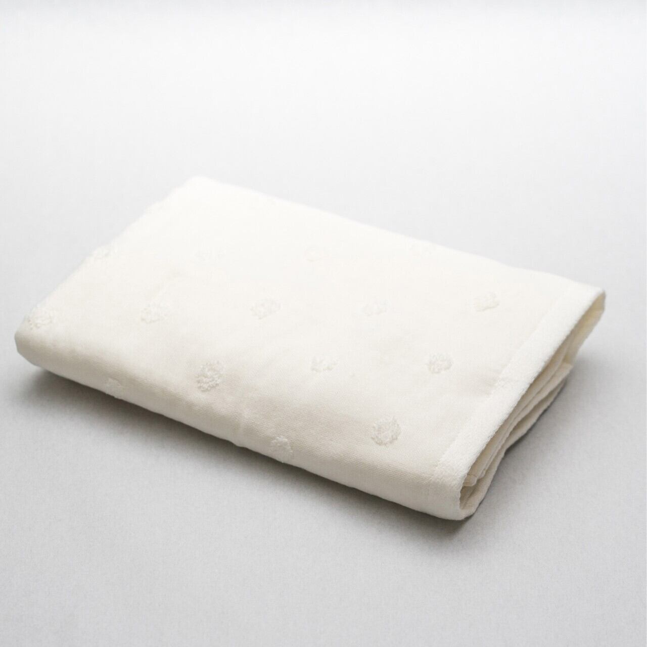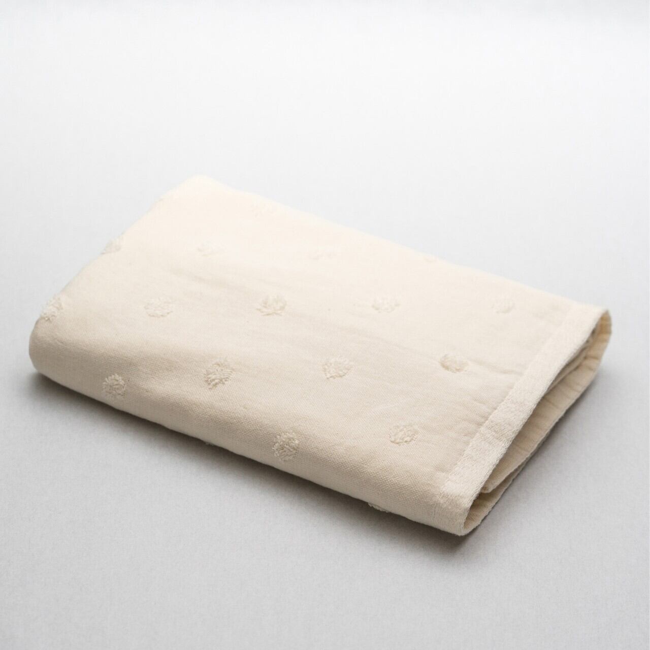名水百選にも選ばれた四国山脈の伏流水と天然の酵素と石鹸を使用して仕上げています。タンザニア産のオーガニック綿を100%使用し、オーガニックコットンの国際基準であるGOTSの認証も受けています。蛍光増白剤、柔軟剤、吸水剤、その他化学薬品を一切使用していません。表面はガーゼ、裏面はパイル仕立て、ガーゼ面にはパイルで水玉模様を表現し、可愛い商品に仕上がっています。洗濯を繰り返しても硬くなりにくく、吸水性抜群で心地よく、使用するほど肌になじみます。今治ブランド付き、日本アトピー協会の推薦品です。