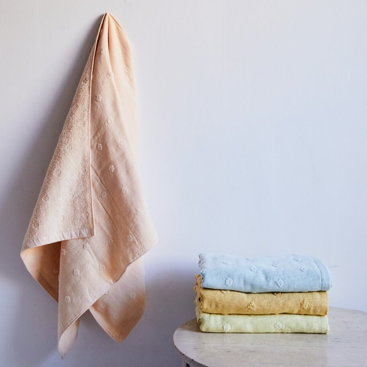 名水百選に選ばれた四国山脈の伏流水を使用し、飲料用のハーブで染め上げています。酵素や純石鹸を使用しているので肌に優しく、安心して使用することができます。表ガーゼ・裏パイルで心地よく、吸水性抜群です。水玉模様をあしらった可愛いデザインになっています。洗濯しても硬くなりにくく、タオルの柔らかさが持続します。ハーブ染めならではの優しく暖かみのある商品です。