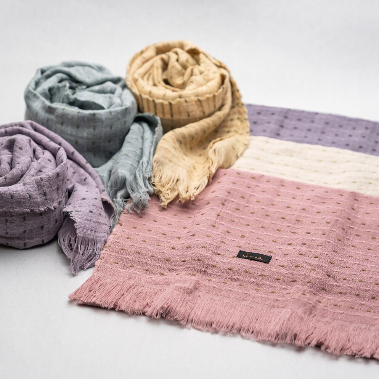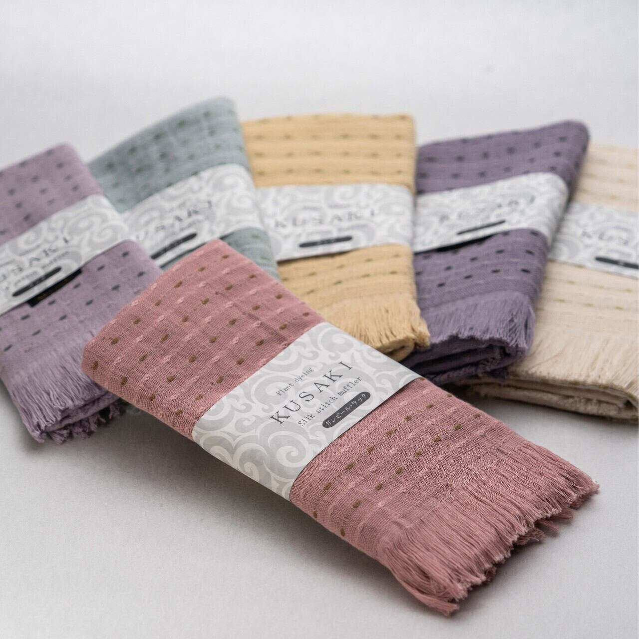 シルクのステッチをアクセントにしたガーゼ織りのコットンマフラーです。
