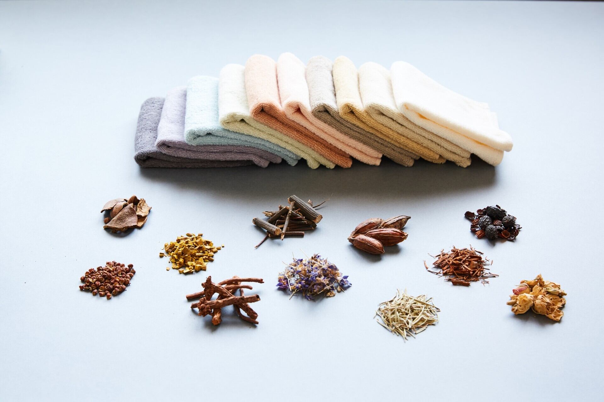 オーガニックコットンのタオルハンカチを厳選した天然の草木で染め上げ、名水百選に選ばれた四国山脈の伏流水で仕上げました。